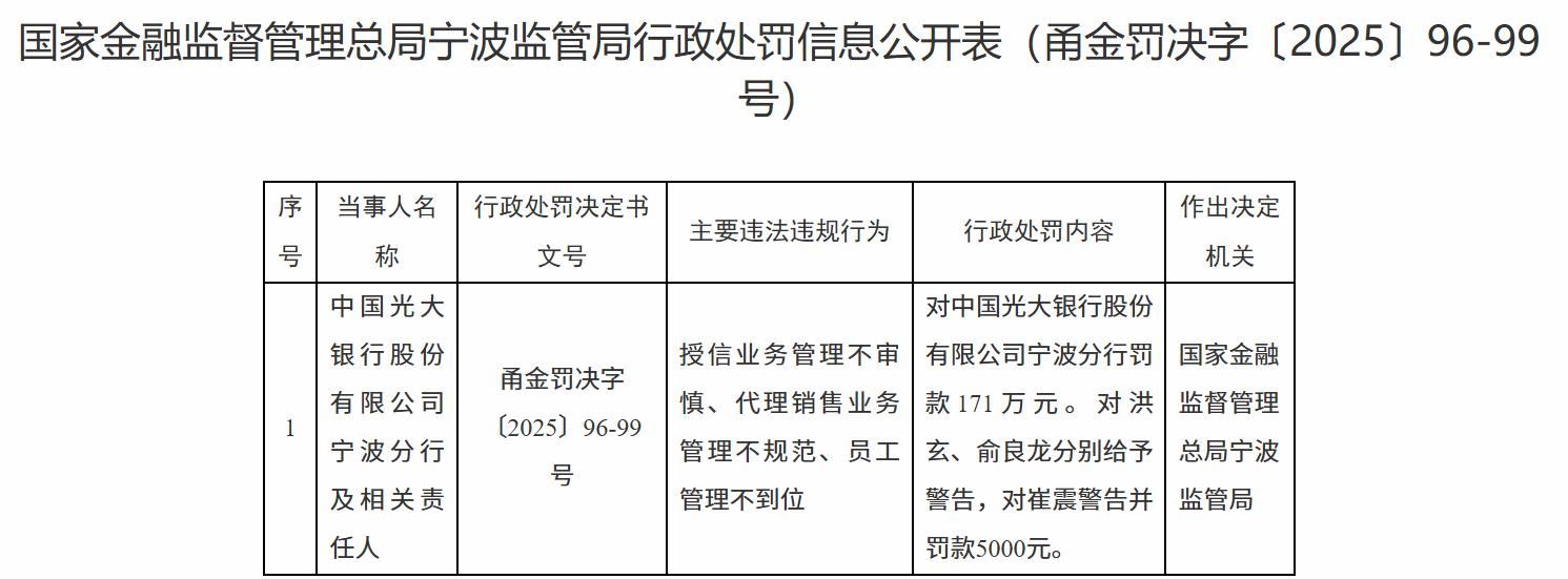 10月17日,国家金融监管总局宁波监管局行政处罚信息公示表显示,光大银行股份有限公司宁波分行及相关责任人因授信业务管理不当、代销业务管理不规范、员工管理不到位,被罚款171万元。洪某、于某分别被给予警告,崔某被给予警告并罚款5000元。