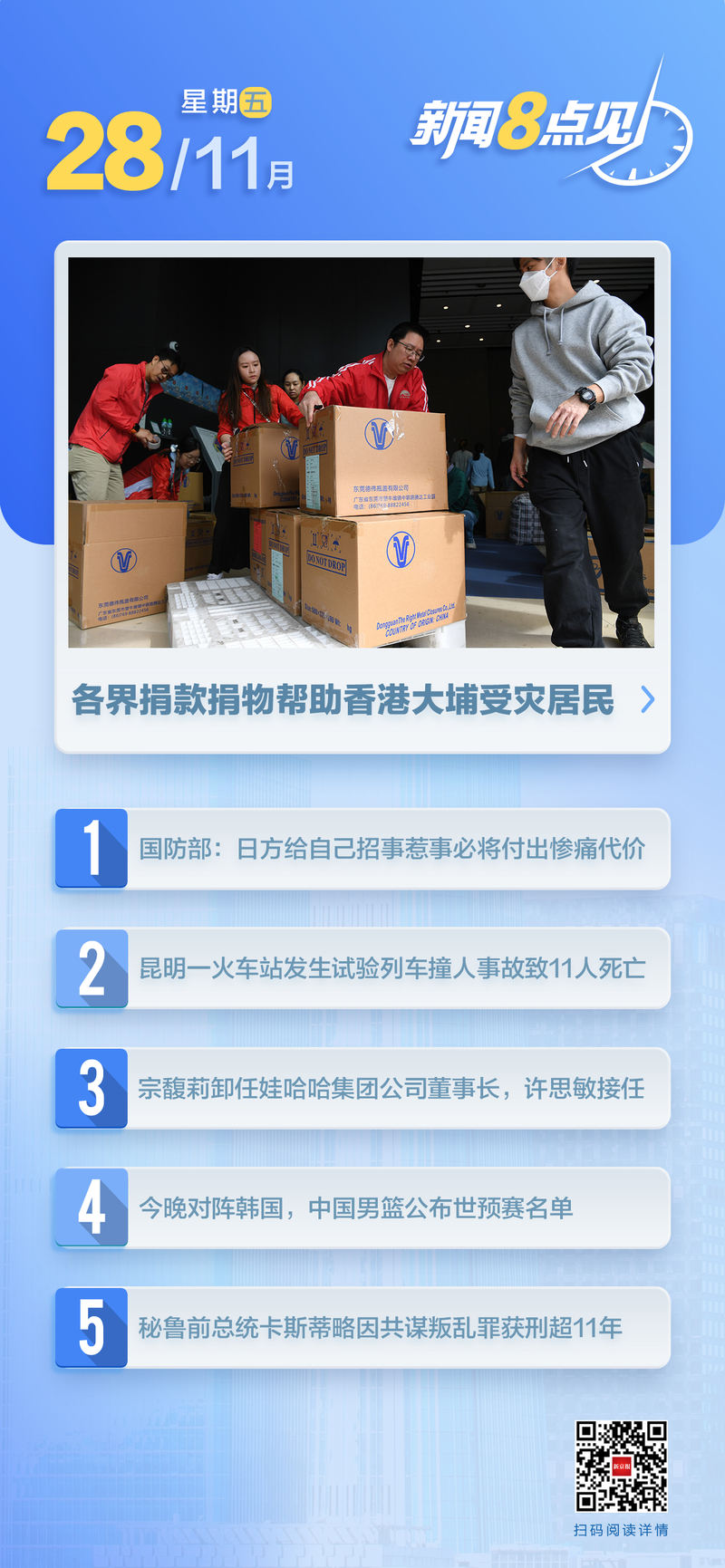 同日,赖清德召开所谓“国家高层会议”。他在会后记者会上宣扬“‘民主台湾’是主权独立”等“台独”分裂谬论,放大大陆“威胁”,叫嚣增加台湾国防预算。中方对此有何评论?国台办发言人陈斌华回应称:赖清德的分裂主义倒台,充满了仇恨和对抗,偏执和傲慢,充分表明了他在“台独”问题上的顽固立场,鼓吹分裂国家的风险,肆无忌惮地挑衅,变本加厉地背叛台湾、伤害台湾,企图扩大“对大陆的威胁”,“依靠外国谋台独”。再次暴露其作为“和平破坏者”和“战争煽动者”的恶习。 毕业台湾问题事关中国主要核心利益,事关14亿多中国人民的民族感情。这是一条不应该跨越的红线。如果是“台湾”分裂势力。国务院新闻办公室11月27日发布《新时代中国的军控、裁军与防扩散》白皮书。白皮书指出,为全面阐释新时代中国军控、裁军与防扩散政策实践,介绍国际和平与安全管理举措,呼吁世界各国携手推进国际军控进程,中国政府发布本白皮书。 。工业和信息化部会同五部门近日联合印发《关于完善消费品供需调节进一步促进消费的实施方案》。 D组组长 杨奇商务部市场运行和消费促进司在11月27日国务院新闻办公室举行的例行政策推介会上表示,商务部下一步将推进汽车流通和消费改革试点,扩大二手车流通,拓展汽车改装、租赁、赛车、房车露营等汽车后市场,扩大汽车全链条消费。重点围绕绿色、智能等方向促进家居用品消费。 。事故原因正在调查中。 11月27日凌晨,测试抗震设备的55537次试验列车在云南省昆明市洛阳镇车站弯道行驶。与进入线路的建筑工人相撞,造成11人死亡、2人受伤。目前,车站交通秩序已恢复正常,救治人员伤者的救治及相关后续工作正在有序进行。事故具体原因正在调查中。 。 11月27日,北京市第十六届人民代表大会常务委员会第二十次会议审议了《北京市人民政府2024年国有资产管理情况综合报告》。报告全面呈现了城邦物业管理工作的新发展、新成果。 。 11月27日,即墨区教育体育局发布情况通报。近日,针对媒体报道的“朝海街实验幼儿园老师打骂孩子”事件,单位高度重视,迅速跟进。涉事教师的教学工作已暂停。公安部门已介入调查,将根据调查结果依法依规处理调查的结果。 。警方迅速赶到现场,将肇事肇事者张某(男,47岁)抓获,并将一名伤者送往医院。经救治,伤者没有生命危险。调查中,警方发现张某语言混乱,行为不正常。目前,案件正在进一步审理中。 。宗福提辞去法定代表人、董事长、总经理职务,由徐思敏接任。同时,还有很多主角发生了变化。企查查股权渗透显示,宗馥莉仍持有杭州娃哈哈集团29.40%的股份。 。中国男篮在公告中表示:“11月28日,2027年国际篮联世界杯亚洲区预选赛第一个窗口期,中国男篮在技术会议上对阵韩国男篮,双方确认了本场比赛的运动员名单。综合考虑到集训期间球员的身体健康状况,中国男篮确定了本场比赛的球员名单:高诗岩、曾凡博、胡明轩、廖三宁、程帅鹏、周琦、胡金秋、王澜一、朱俊龙、李相博、雷蒙、张镇麟。苏一鸣将率领中国队参加9月4日至6日从首钢跳台滑雪“雪飞天”出发的2025-2026长虹国际滑雪联合会单板滑雪及自由式跳台滑雪世界杯(北京)比赛。根据报名情况,北京冬奥会冠军苏一鸣等中外名将已确认参赛。中国运动员方面,北京冬奥会冠军苏一鸣将率领中国队,亚冬会冠军杨文龙、自由式滑雪世界杯冠军刘梦婷等实力选手也将参赛。 (央视体育)阅读全文>>>体操运动员张伯恒等参加米兰冬奥会火炬在希腊的传递。当地时间11月27日,米兰-科尔蒂纳冬奥会火炬传递在希腊进入第二天。中国体操运动员张伯恒、田径运动员陈玉杰、篮球运动员王思雨和越野跑运动员吴永波参加了当天在希腊帕特雷附近的火炬传递。 。当地时间8月27日,秘鲁最高法院特别刑事法庭正式宣布对前总统佩德罗·卡斯蒂略的刑事判决。卡斯蒂略因2022年12月7日发动政变未遂罪被判犯有阴谋叛乱罪,被判处11年5个月15天监禁。佩德罗·卡斯蒂略将于2021年7月至2022年12月担任秘鲁总统。他在试图解散国会并被指控企图政变后被国会驱逐并入狱。 。当地时间11月27日,俄罗斯外交部宣布,针对波兰的决定关闭俄罗斯驻格但斯克总领事馆 俄罗斯决定自2025年12月30日起关闭波兰驻伊尔库茨克总领事馆。俄罗斯外交部称当天召见了波兰驻俄罗斯大使。(央视新闻)阅读全文>>>编辑魏冕刘喆 校对刘军